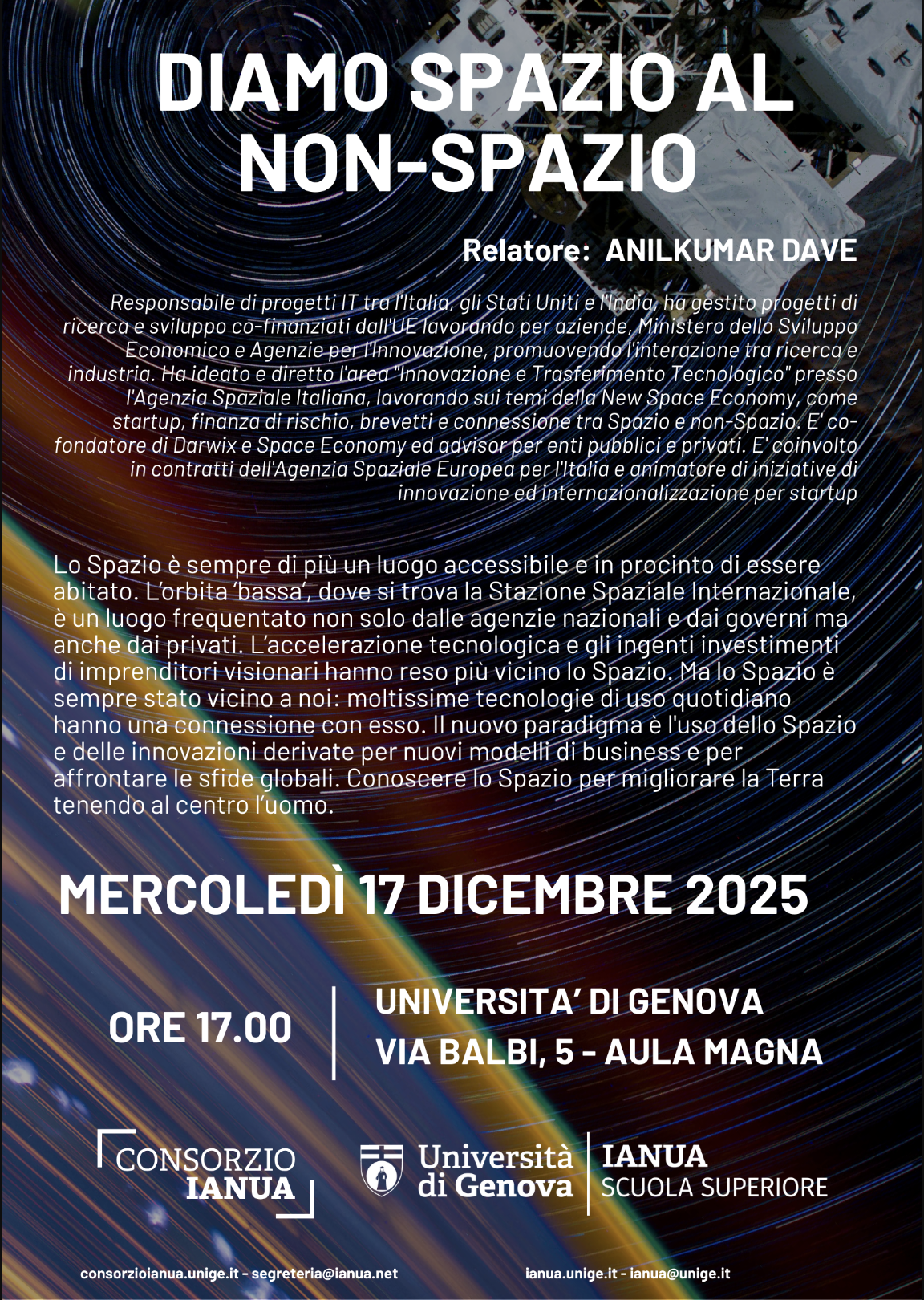 Lo Spazio è sempre di più un luogo accessibile e in procinto di essere abitato. L’orbita cosiddetta ‘bassa’, quella dove si trova la Stazione Spaziale Internazionale, è ormai un luogo frequentato non solo dalle agenzie nazionali e dai governi ma anche dai privati. L’accelerazione tecnologica e gli ingenti investimenti di imprenditori visionari hanno reso più vicino lo Spazio. Ma lo Spazio è sempre stato vicino a noi, anche se non ce ne siamo resi conto: moltissime tecnologie di uso quotidiano hanno una connessione con esso. Il nuovo paradigma è l'uso dello Spazio e delle innovazioni derivate per nuovi modelli di business e per affrontare le sfide globali.