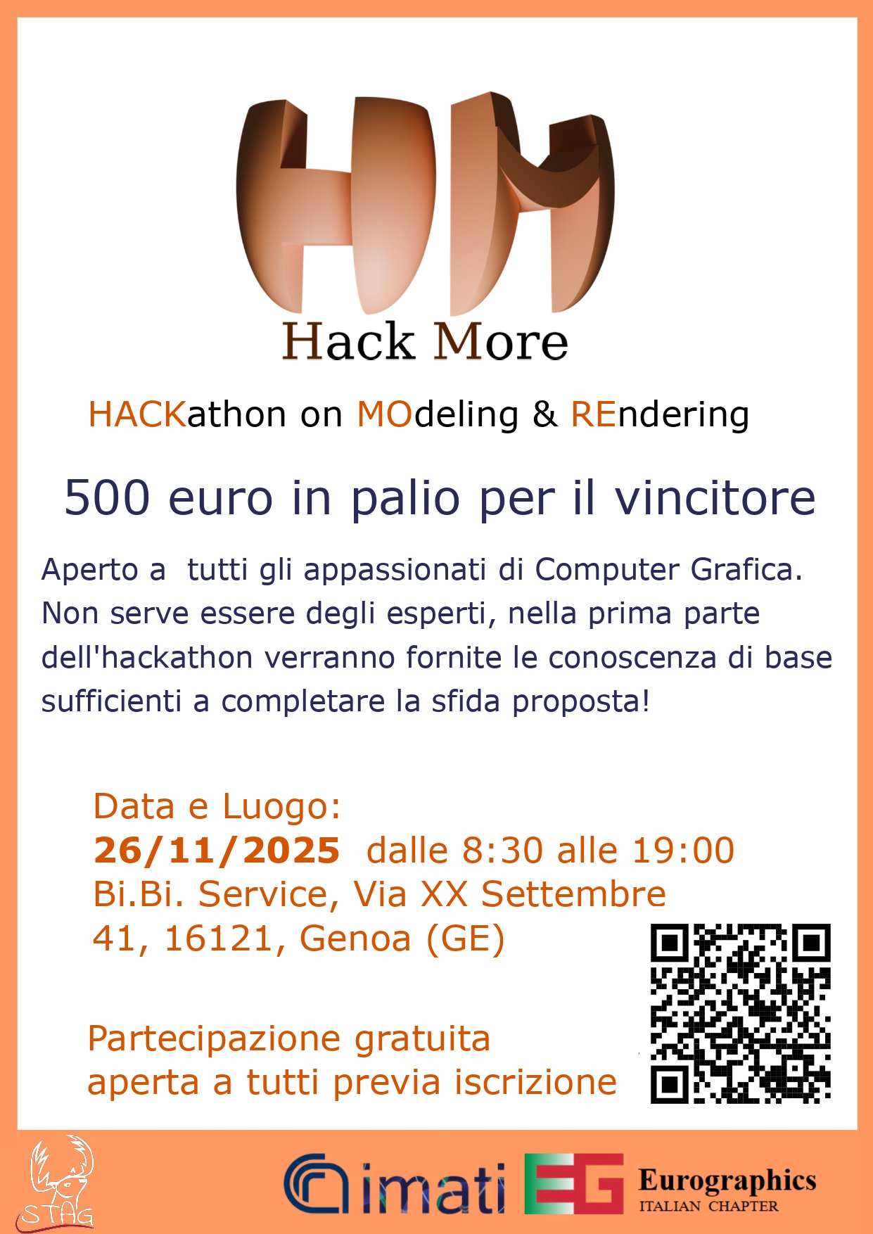Hack More è un hackathon di una giornata aperto a tutti, con lo scopo di avvicinare i giovani talenti della modellazione e rendering 3D alla comunità scientifica di Computer Graphics.