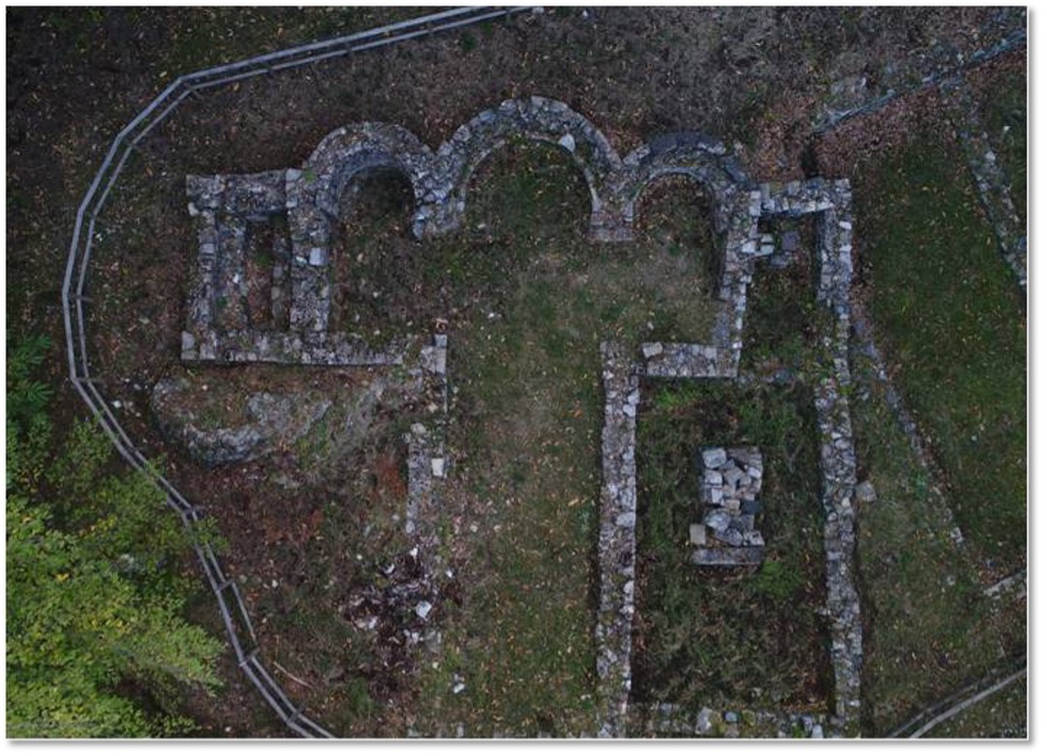 Fotografia zenitale della chiesa del complesso di San Nicolao di Pietra Colice al termine delle indagini archeologiche